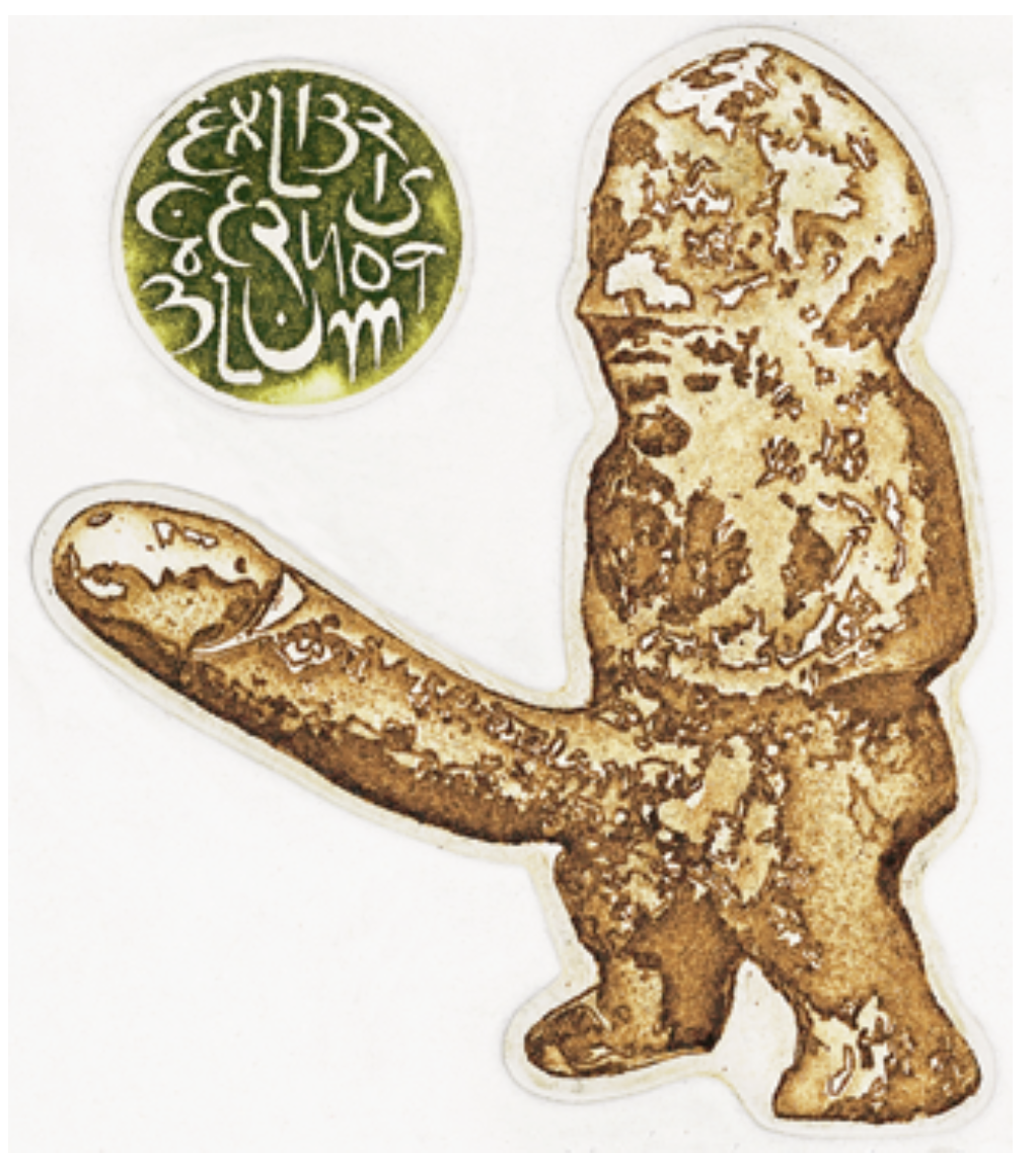 We see writing in two different positions in Ex-libris. It is either in the picture together with it or only the typographic and calligraphic elements turn into a visual form and Ex-libris is formed. The writing element should display a balance whether it is in the picture or used alone. These words (Ex-libris and the name and surname of the person for which Ex-libris is made), which are a part of the visual show, cannot be thought separately from the picture. Its position, direction and dimension in the picture should be well determined. A great difference between the sizes of the letters or the words being written with different characters deteriorates unity. When writing overshadows the picture with its structure or color or when it is too small to read, the effect of Ex-libris is weakened. If the writings within the Ex-libris are not placed in their suitable place, the equilibrium is destroyed. The inaccordance between writing and picture negatively affects the overall unity and composition of the picture. A misapplication of writing, loss of balance between the closed and open spaces of letters turns Ex-libris into a more complex thing. Therefore bold characters are read with more difficulty compared to light characters. One of the most important factors that facilitates reading is the balance between the inner spaces of letters and the spaces between the letters. It is hard to read an “a” or “u” which does not have proper inner space. Writing and picture must be in accordance.
